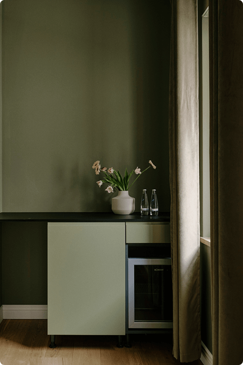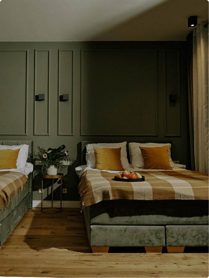 Two open-plan rooms without partition walls, each featuring a queen-size bed, a bathroom with a shower, and a balcony. Accommodates up to 4 guests, with direct elevator access.